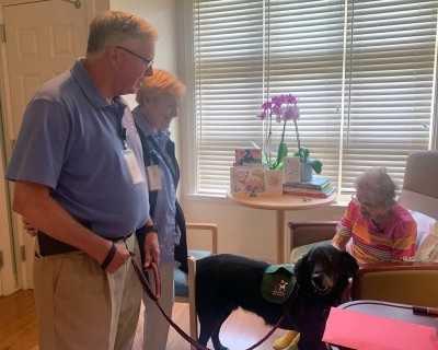 A Hospice House resident visits with therapy dog, Fred, and volunteers.
